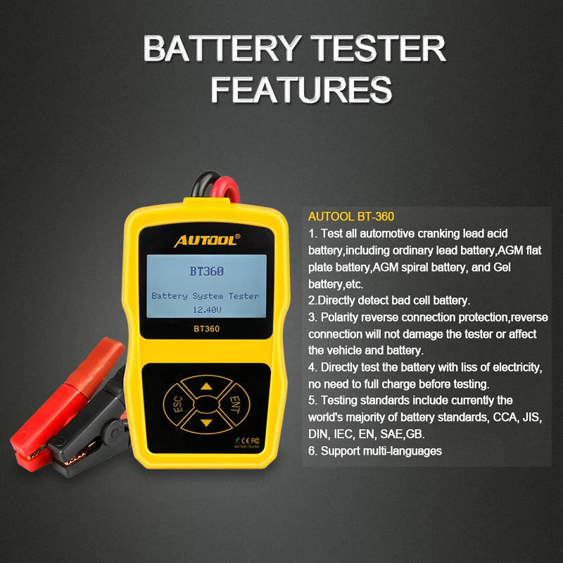 Product Name: Sr. Cartool BT360 Analizador de batería de coche Digital 12V Auto para BT 360 de GEL AGM sumergido Analizador de baterías automotrices CCA