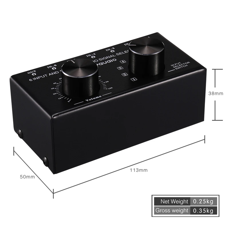 Product Name: 6 entrada 1 salida conmutador de selección de fuente de Audio RCA señal de entrada conmutador con ajuste de volumen y Manu