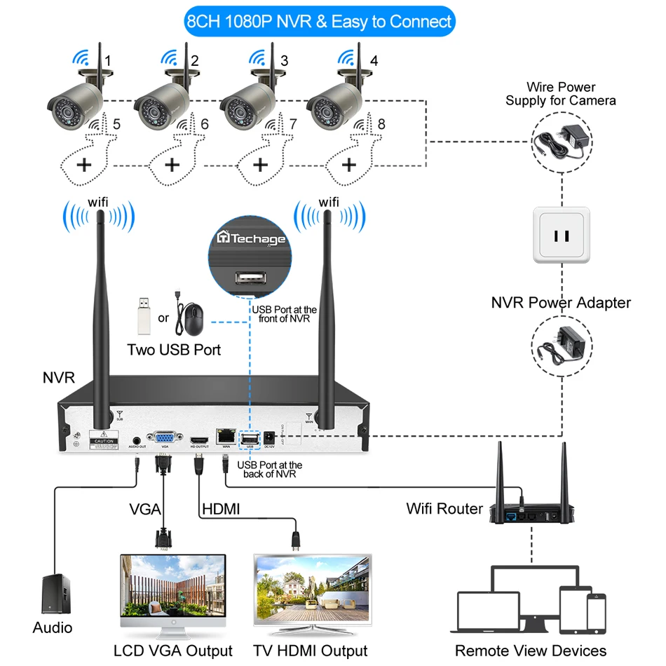 Product Name: Techage H.265 8CH 1080P HD inalámbrica NVR Kit de sistema de seguridad CCTV 2MP de corte IR al aire libre de Audio Wifi Cámara P2P Video Vigilancia Conjunto