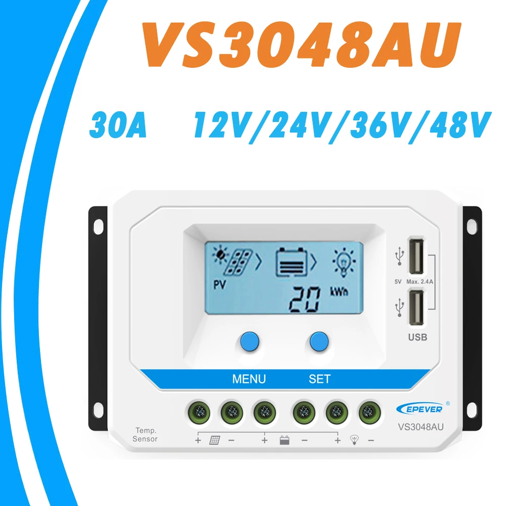 Product Name: Controlador Solar EPEVER 30A 12V 24V 36V 48V Auto VS3048AU PWM controlador de carga con pantalla LCD incorporada y Puerto USB doble de 5V