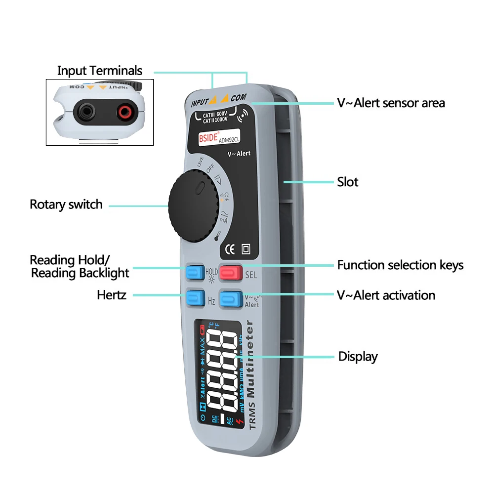 Product Name: BSIDE ADM92CL pantalla en Color multímetro Digital rango real RMS Auto 6000 TRMS Tester con cable vivo comprobar Kit de medidor de diodo de temperatura