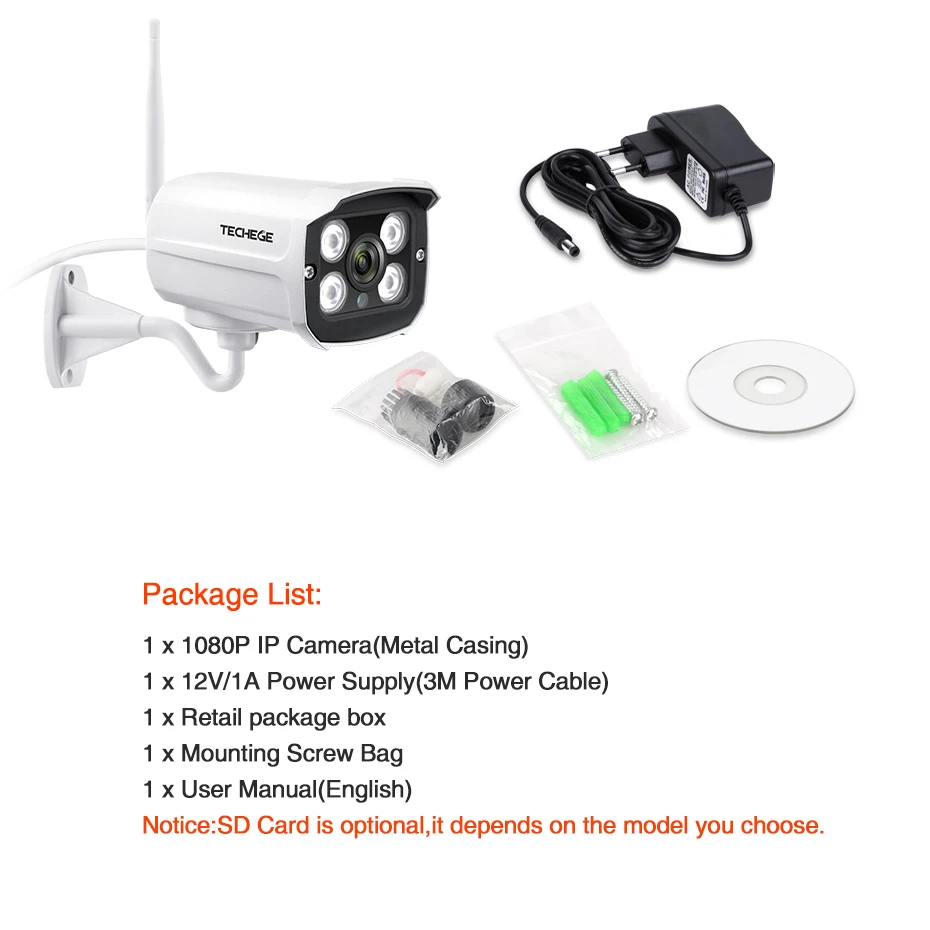 Product Name: Techege HD 1080P ranura para tarjeta SD inalámbrica Audio IP Cámara 2.0MP wifi cámara de seguridad visión nocturna Metal impermeable Cámara al aire libre