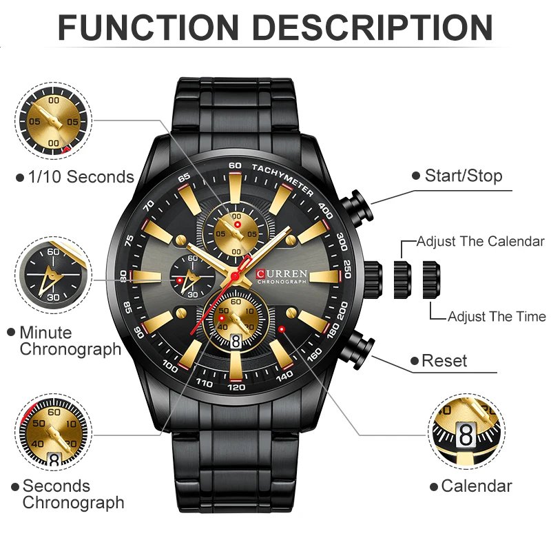 Product Name: Nuevo reloj CURREN para hombres, marca superior, reloj de pulsera deportivo de cuarzo dorado negro, reloj cronógrafo para hombre, reloj de fecha, relojes masculinos de acero inoxidable