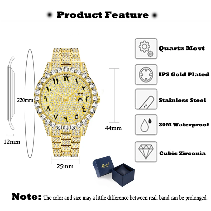 Product Name: Relojes Para Hombre con números árabes de MISSFOX reloj de lujo de primera marca para hombre, Diamante grande de oro de 18 quilates con Canlender, Reloj clásico con hielo para hombre