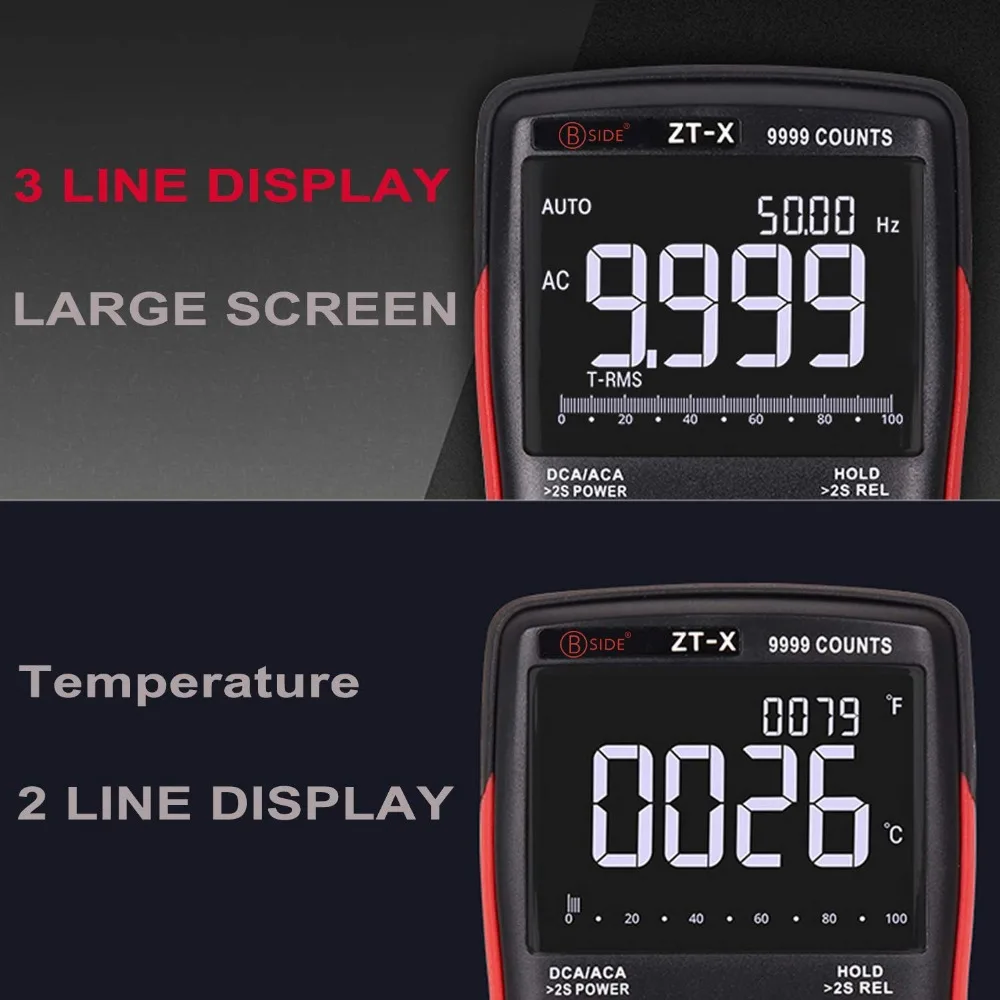 Product Name: Multímetro Digital BSIDE ZT X True RMS pantalla Triple de 3 líneas 9999 cuentas medidor de capacitancia de voltaje CA CC DMM